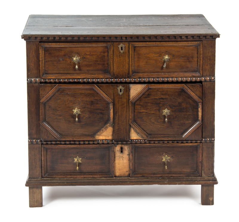 having a rectangular top above a conforming case fitted with three drawers, raised on block feet.