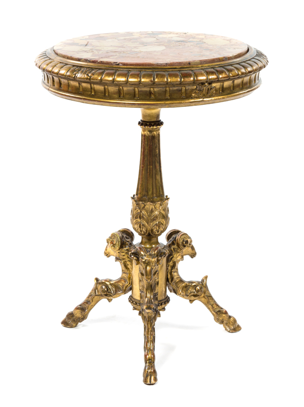 having a circular marble inset top over a dentiled frieze, set on a tapering fluted standard, raised on a tripod ram mask carved base ending in monoped supports.