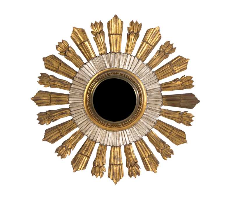 having a circular convex plate within a carved frame issuing stylized solar rays.