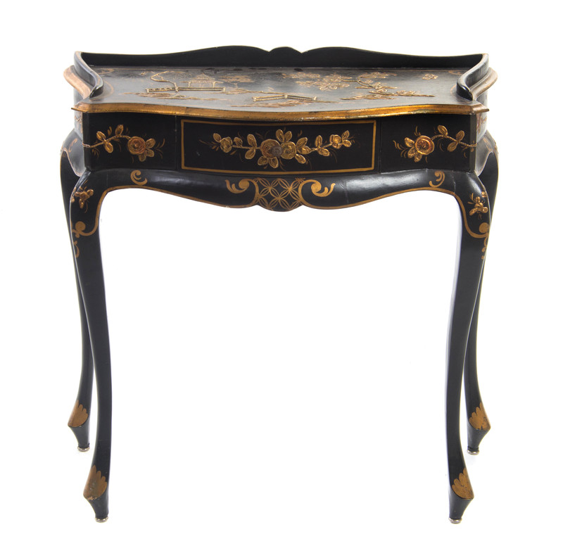 having a serpentine top above the conforming frieze set with a single drawer and raised on cabriole legs, having Chinoiserie decoration throughout.