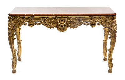 having a rectangular marble top over the frieze carved to show masks, foliate scrolls and garlands, raised on cabriole legs.