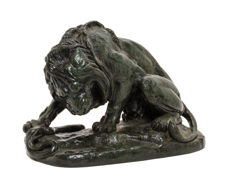 depicting a snake being attacked by a lion, signed Barye on base.