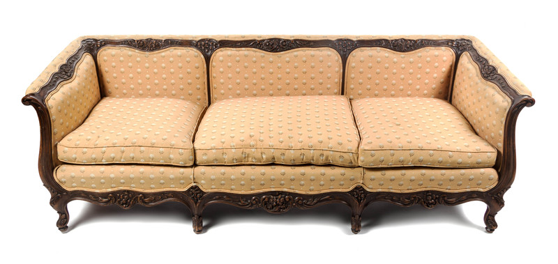 having an upholstered back, arms and seat above a foliate carved seat rail, raised on cabriole legs.