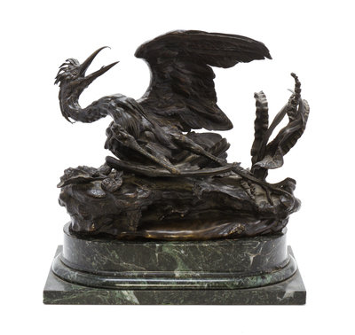 depicting a heron impaled with an arrow, set on a marble base.