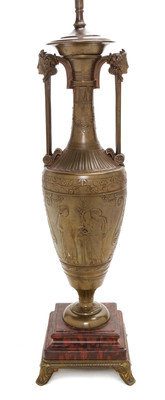 cast with twin handles headed by busts above a continuous band of classical figures in relief, raised on a marble base and mounted as a lamp, the urn signed Henry Cahieux and F. Barbedienne Fondeur.