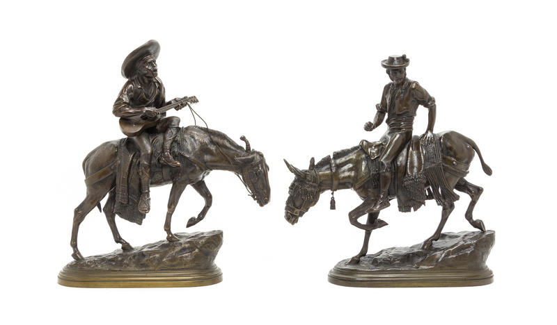 depicting two Spanish men on mules, one playing the guitar, the other missing an element from his right hand, each signed I. Bonheur to the base, lacking foundry marks.