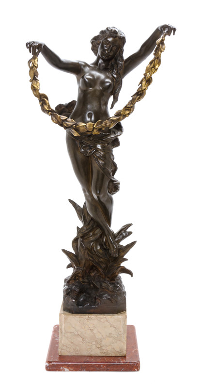 cast to show a standing maiden holding a foliate garland, signed indistinctly and raised on a marble base.