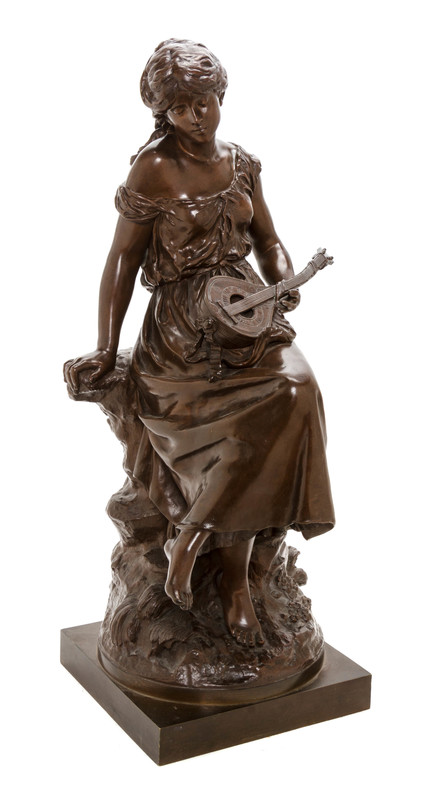 depicting a female lute player seated on rockery, signed Auguste Moreau.
