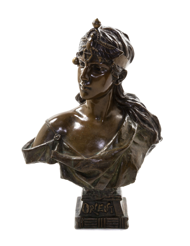 depicting an Orientalist maiden wearing an eagle headdress, raised on a pedestal base entitled Orient, incised E. Villanis over her right shoulder.