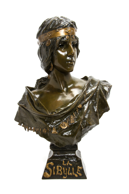 La Sibylle, depicting a maiden wearing a crown, signed E. Villanis at her shoulder and titled on the socle with Societe des Bronzes de Paris seal at the back.
