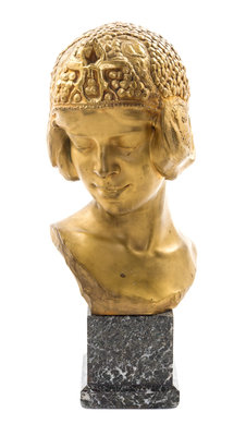 depicting an Art Nouveau lady wearing a headdress, incised Fix Masseau and bearing a Jollet & Cie foundry stamp raised on a marble pedestal.