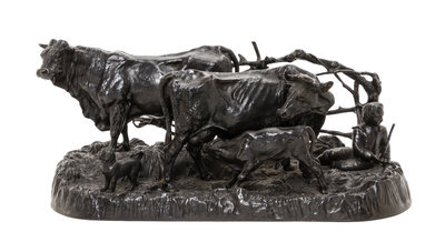 depicting cattle, a boy with a staff and a dog on a naturalistic ground.