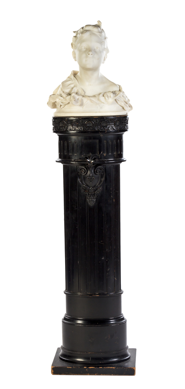 having a bow on her head to keep her braid, raised on an associated black lacquered pedestal.