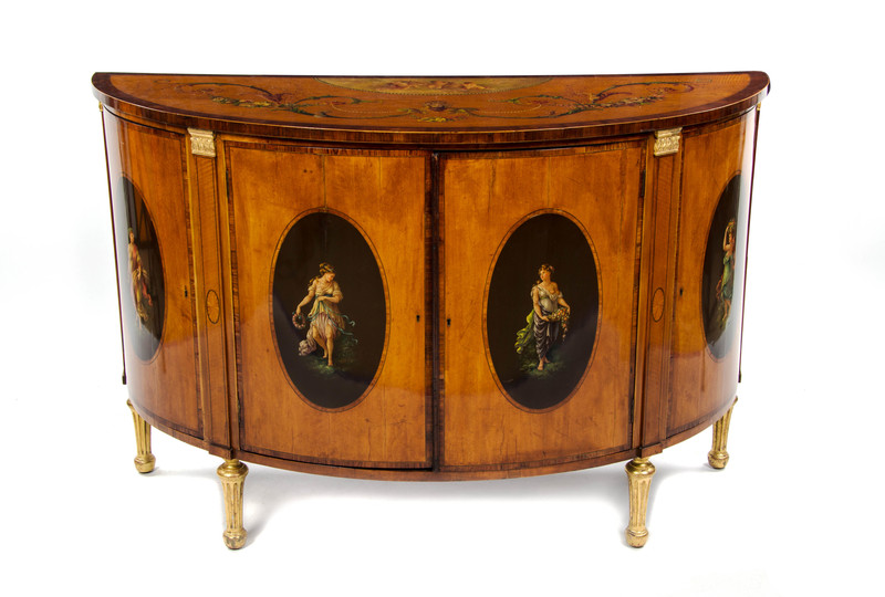the demilune crossbanded top having a cartouche depicting three cherubs amongst the clouds and a central mask flanked by rinceau and floral garlands, over a conforming case enclosing four cupboard doors each decorated with an oval cartouche depicting a maiden emblematic of seasons, raised on fluted cylindrical tapering legs.