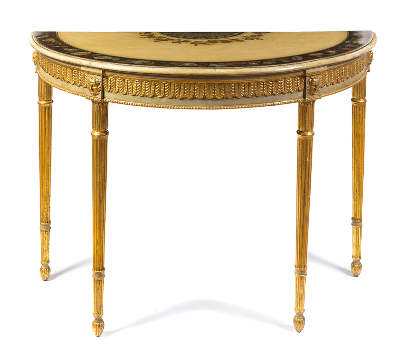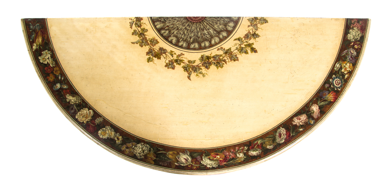 the demilune top painted to show a Prince of Wales feathers fan, a concentric foliate vine and a band of floral garlands on a cream ground, over a palmette carved frieze, raised on fluted cylindrical tapering legs headed by masks.