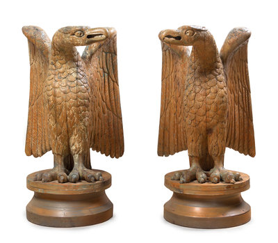 each depicted with wings open behind their backs, raised on a circular pedestal base.