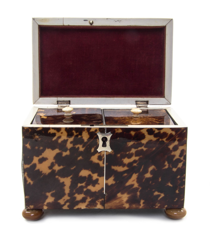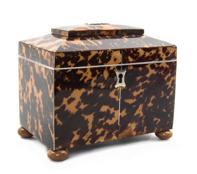 of sarcophagus form, having a hinged lid raised on flattened bun feet.