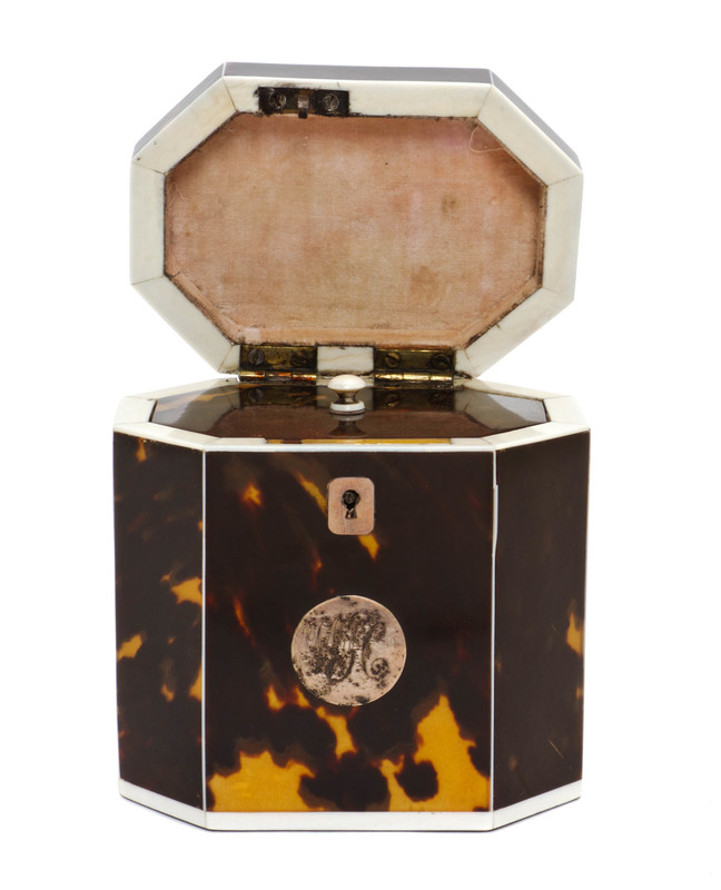 of octagonal form, having a domed lid and a monogrammed medallion.