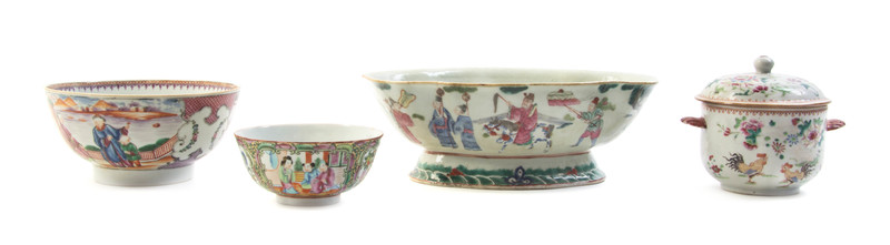 comprising a lobed famille rose bowl, a rose medallion bowl, a figural bowl and a covered bowl with cockerel decoration.