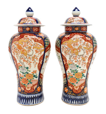 A Pair of Imari Porcelain Urns and Covers,