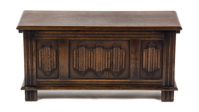 having rectangular lift-top over the linen fold carved body.