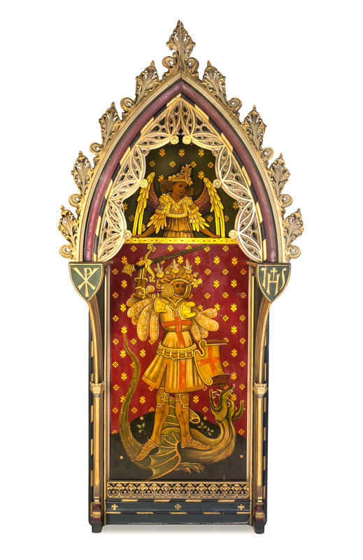 the domed portion depicting an angel above a rectangular portrait of St. George slaying a dragon, set within a painted and gilt decorated carved frame.