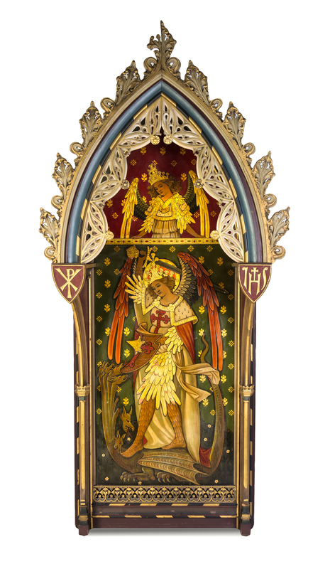 the domed portion depicting an angel above a rectangular portrait of St. Michael slaying a serpent, set within a painted and gilt decorated carved frame.