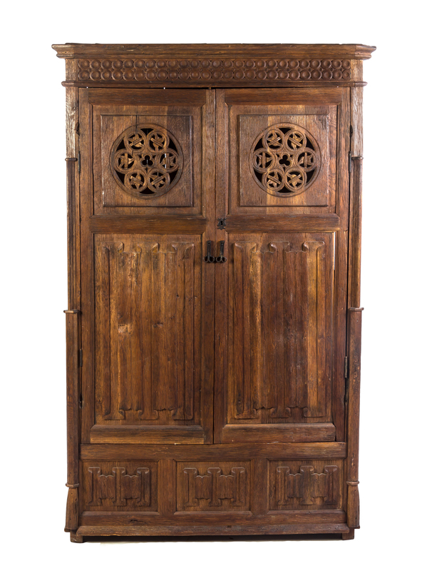 having two doors with roundels worked to show pierce carved tracery above linenfold panels.