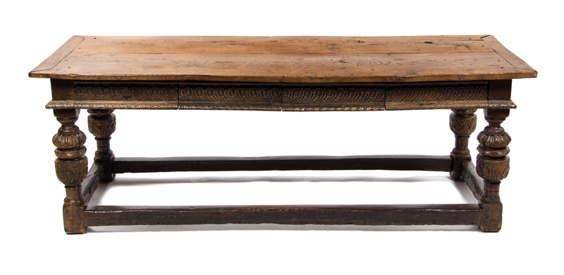 having a rectangular plank top above a carved frieze, raised on baluster form legs joined by stretchers.