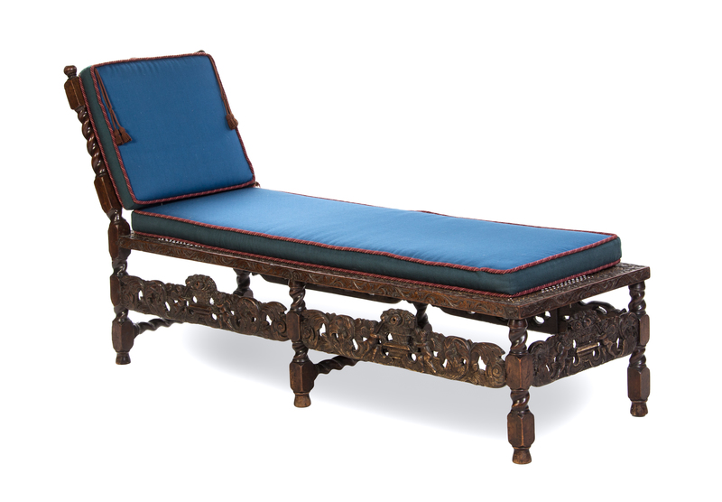 having a pierce carved crest rail flanked by barley twist stiles above a padded seat, raised on block turned legs.