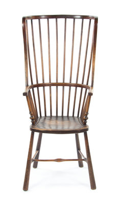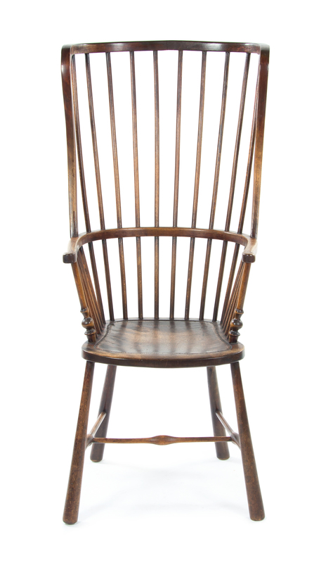 having a spindle back and plank seat raised on tapering legs joined by an H-form stretcher.