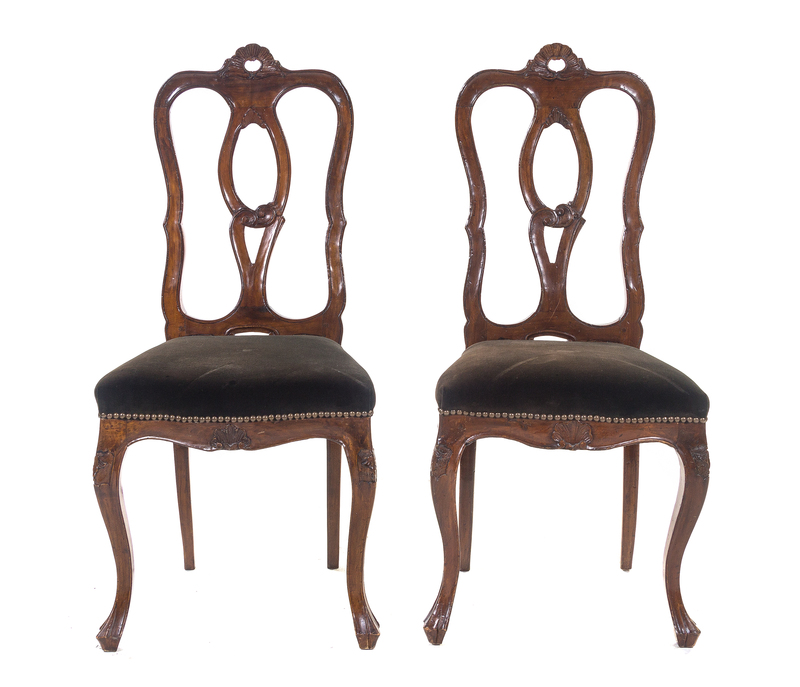 each having a shell carved crest rail over an openwork splat above a stuffover seat, raised on cabriole legs.