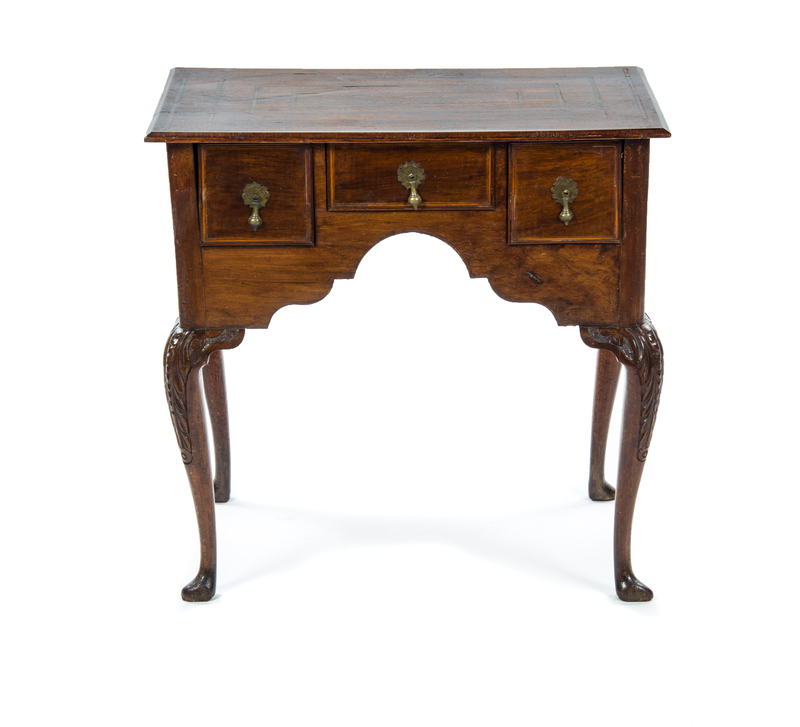 having a rectangular top with concentric line inlay over three drawers, raised on carved cabriole legs ending in pointed pad feet.