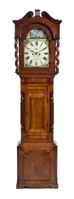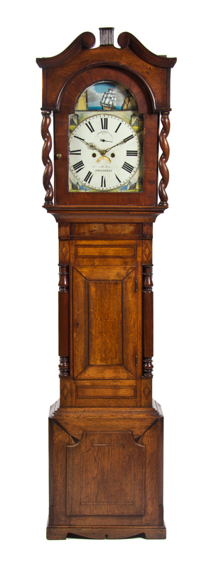 having a circular dial with Roman numeral hours beneath a moon phase dial and automaton ship on an arched face painted to show a village, set in an oak case.