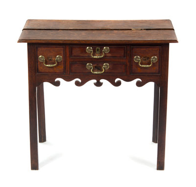having a rectangular top over two short drawers centering two deep drawers above a shaped frieze, raised on square legs.