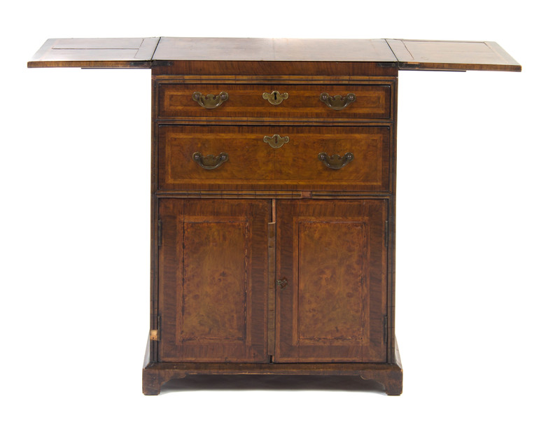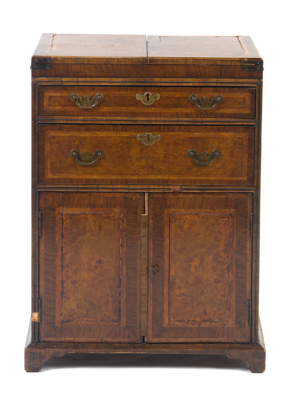 having a rectangular split hinged top over two graduated drawers and two paneled doors, raised on short bracket feet.