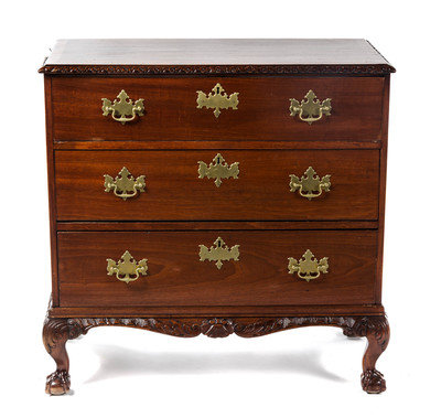 having a rectangular top with a carved edge over three graduated long drawers and a carved apron centered with a shell, raised on claw and ball feet.