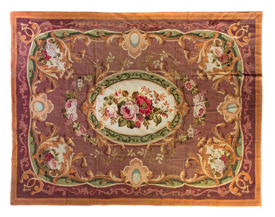having a central floral cartouche within floral swags on a taupe ground within a foliate scroll and floral bouquet border.