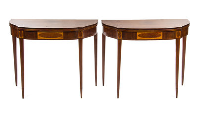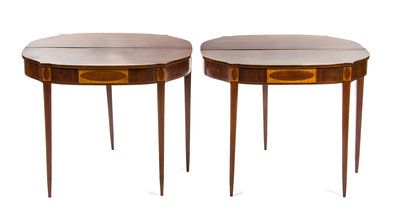 A Pair of Sheraton Mahogany, Satinwood and Oak Flip-Top Tea Tables,