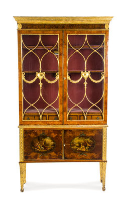 in two parts, the upper section having a carved cornice over the frieze painted to show anthemions above glazed doors centered by urns suspending swags, the lower section with two doors painted to show pastoral scenes, raised on reeded tapering legs.