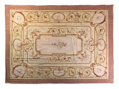 having a central floral spray in a floral cartouche on a pink and tan ground, all within an acanthus scroll and floral bouquet border.