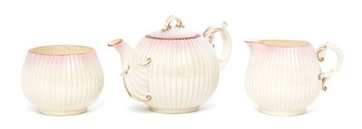 comprising a teapot, an open sugar and a creamer, each of spherical form with vertical linear decoration, having gilt banding and highlights.