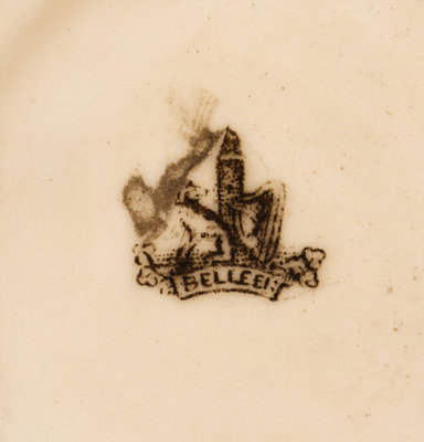 of tapering form with a mask spout, decorated with two ribbon-tied landscape scenes, having first Belleek black mark.