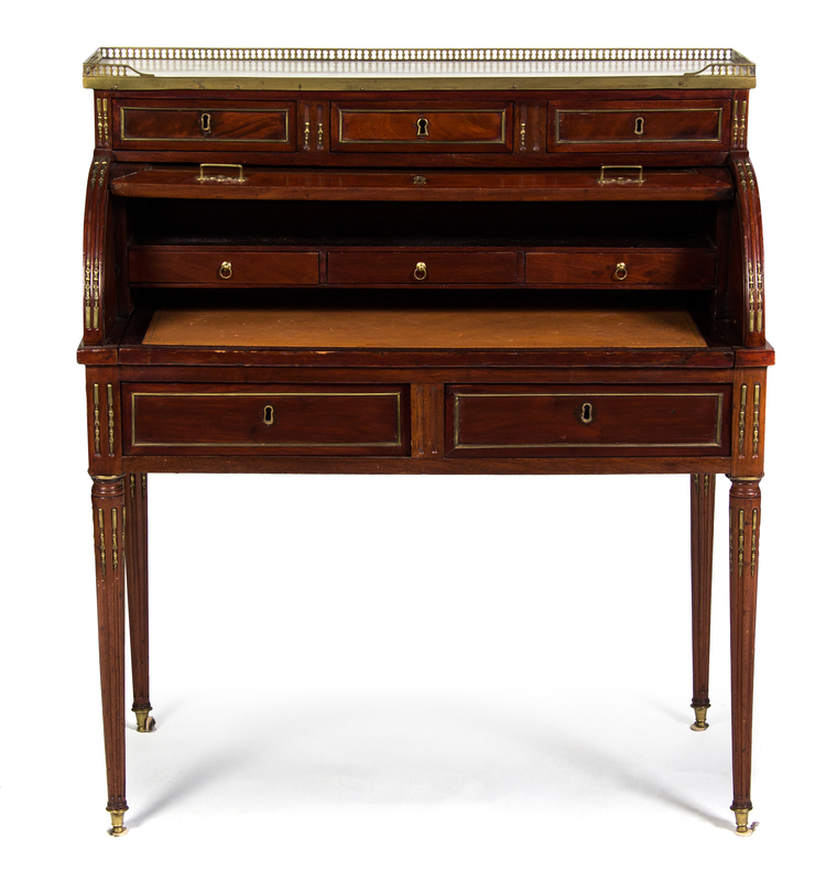 having a rectangular three-quarter galleried marble top over three drawers and a cylinder opening to a fitted interior, the frieze set with two drawers, raised on fluted tapering legs ending in caps.