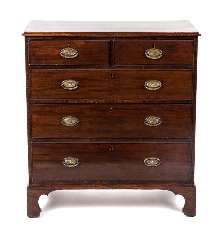 having a rectangular top over two short and three graduated long drawers, raised on bracket feet.
