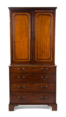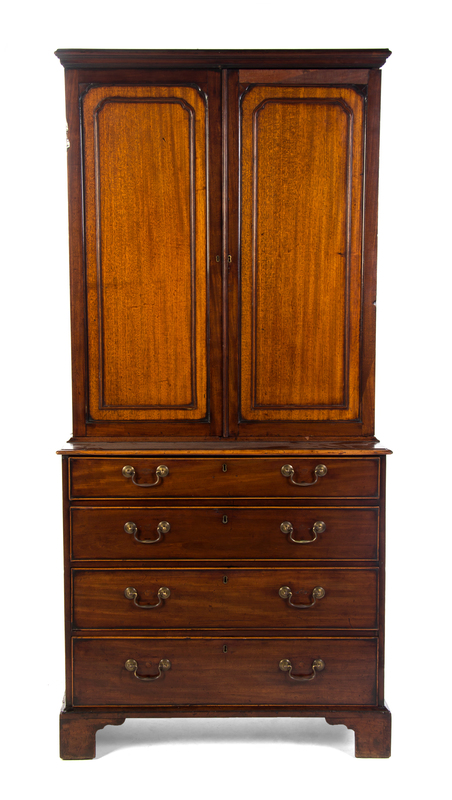 in two parts, the upper section with a molded cornice and paneled doors, the lower section with four graduated drawers, raised on bracket feet.