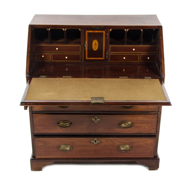 the drop down writing surface inlaid to show an urn and opening to a felt-lined writing surface and a fitted interior with a series of niches and a door inlaid to show a shell, the case fitted with four graduated drawers, raised on bracket feet.