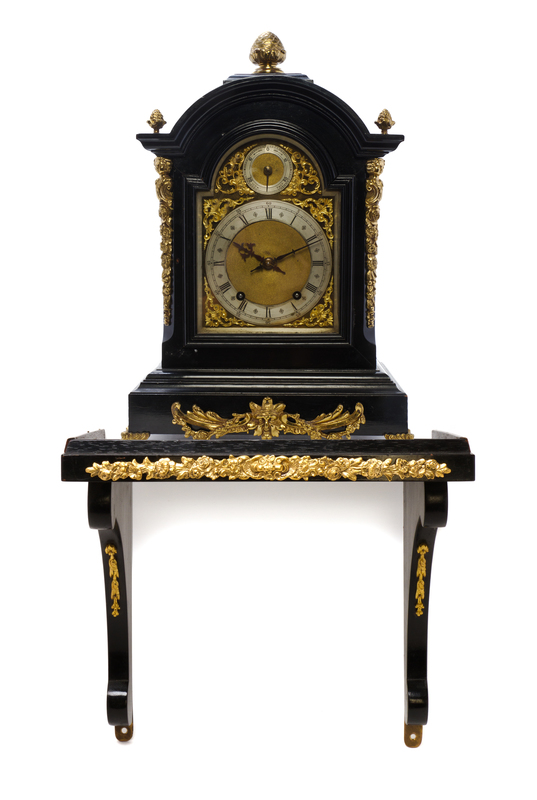 having a circular silvered chapter ring with Roman numeral hours and Arabic minutes set in an arched face and a conforming case, raised on foliate scroll feet and a conforming bracket.