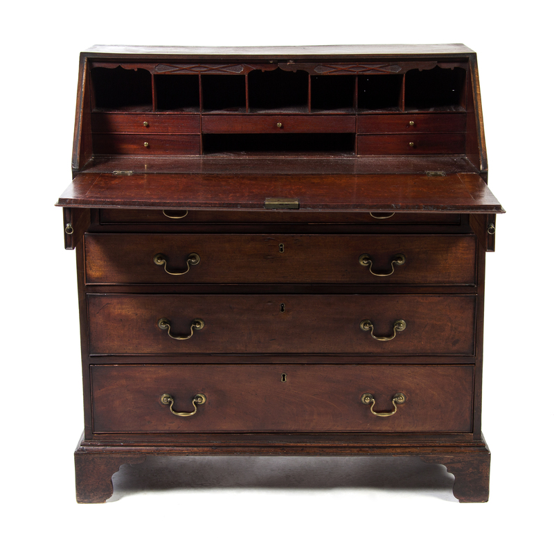 having a rectangular top over the drop down writing surface opening to a fitted interior with a blind fret carved panel, the case set with four graduated drawers, raised on bracket feet.