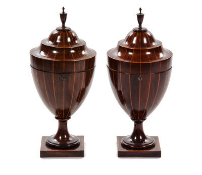 each of urn form having an attached lift-off cover opening to a fitted interior, raised on a square foot.